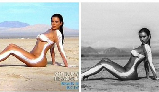 И вот очередной свежий пример, на днях эта гламурная леди опубликовала свою уже известную ню-фотосессию в пустыне. Сделана она была еще прошлой весной, и успела облететь ряд изданий, а так же снимки распространились и в интернете. На них звезда полностью обнажена и лишь линии белой краски местами покрывали её тело и слегка маскировали грудь. Теперь фото были выложены в черно-белом варианте, но поклонники тут же заметили, что это далеко не единственно их отличие от ранее опубликованных. На этих снимках светская львица выглядит гораздо тоньше и изящнее, пропал живот, а вместо него прорисовалась талия, руки и ноги стали заметно стройнее. Естественно, такой подход знаменитости вызвал волну критики, но Ким, похоже, это не слишком заботит, ведь главное, что так она нравится сама себе гораздо больше. Напомним, несколько дней назад младшая сестра светской львицы, юная модель Кайли шокировала поклонников свой фэшн-фотосессией в инвалидном кресле.