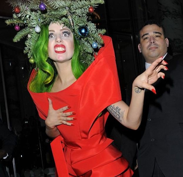Очередная предновогодняя выходка Гаги – упаковаться в платье, отсылающее своим алым цветом к мешку Деда Мороза или Санта-Клауса, а на голову водрузить ёлку. Причём, ёлочка на поверку оказалась вовсе не творением шляпных дел мастера и не искусственной имитацией. Обыкновенная живая ёлка, украшенная банальными шариками разных цветов. Для полноты образа Гага под ёлочку напялила зелёный парик. То ли Снегурка, то ли русалка, теперь уж и не разберешь.